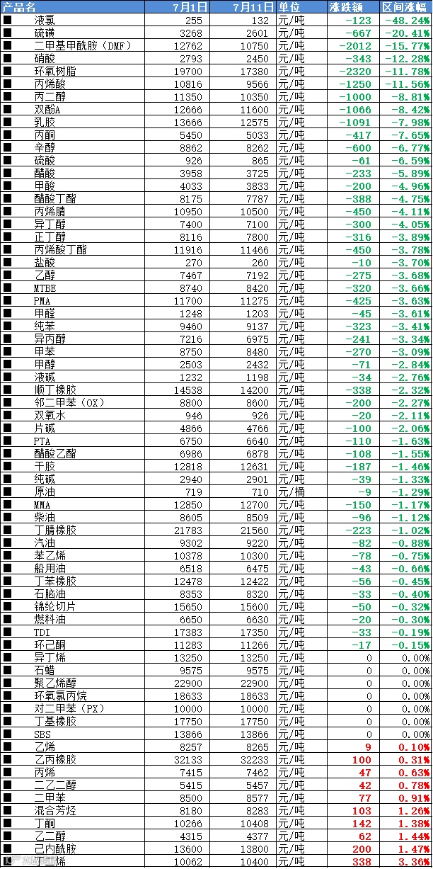 化工大宗榜:跌跌跌!50种化工品大跳水!