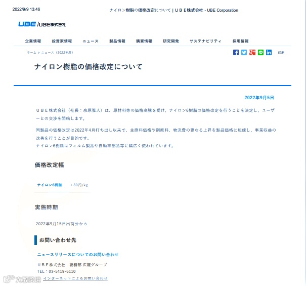 9月9日,宇部兴产株式会社宣布将从9月15日起,上调公司PA6树脂价格,涨幅为80日元/吨(约合人民币3882元/吨)。