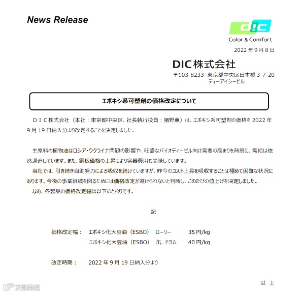 相关原材料价格不断上涨,9月8日,DIC株式会社宣布,将从9月19日起上调环氧基增塑剂(ESBO)的价格。具体涨幅如下: