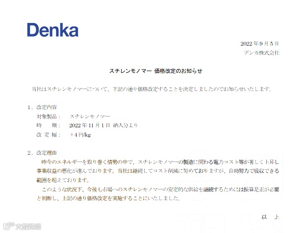 9月5日,Denka株式会社宣布上调苯乙烯单体的价格,涨幅为4日元/kg(约合人民币194元/吨)。