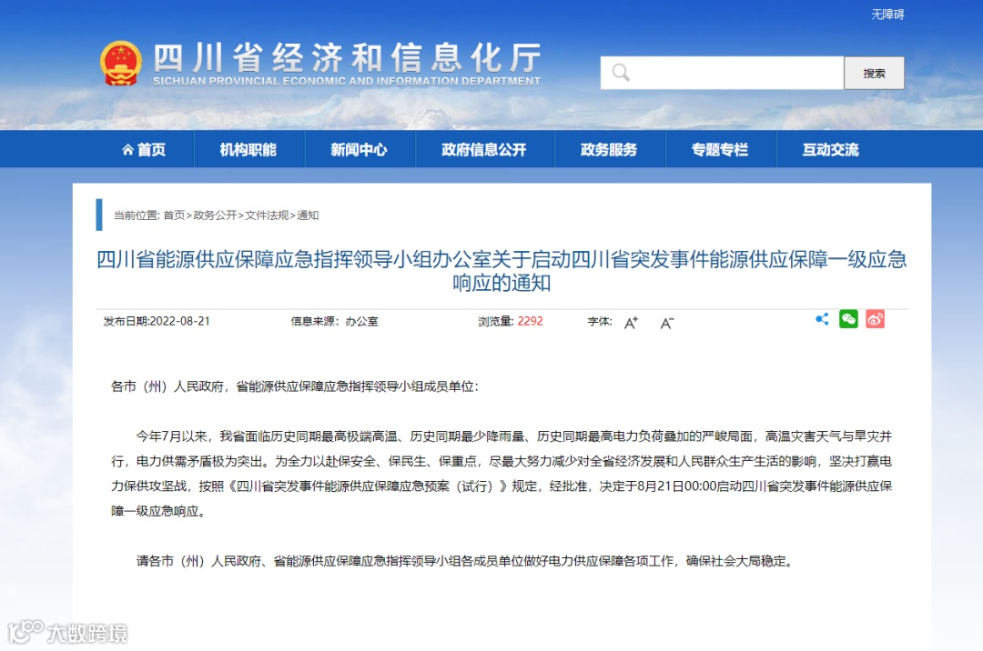 8月21日,四川省能源供应保障应急指挥领导小组办公室发布通知,于21日零时启动四川省突发事件能源供应保障一级应急响应。这是2022年1月省政府办公厅印发《四川省突发事件能源供应保障应急预案(试行)》以来,四川首次启动最高级别的应急响应(从高到低分别为一级、二级、三级、四级响应)。