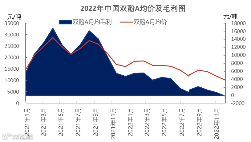 上游双酚A情况也不容乐观,2022年双酚A高开低走,甚至在12月中上旬出现毛利负数的迹象。截至目前,双酚A报价14600元/吨,行业平均毛利2500元/吨,分别下降34.3%和 76.5%。据行业人士预测,产能一体化仍是双酚A的发展趋势,但数据显示双酚A下行周期远远长于上行周期,预计双酚A在2023将处于低位运行,产业链上的原料或将受其影响涨势放缓。