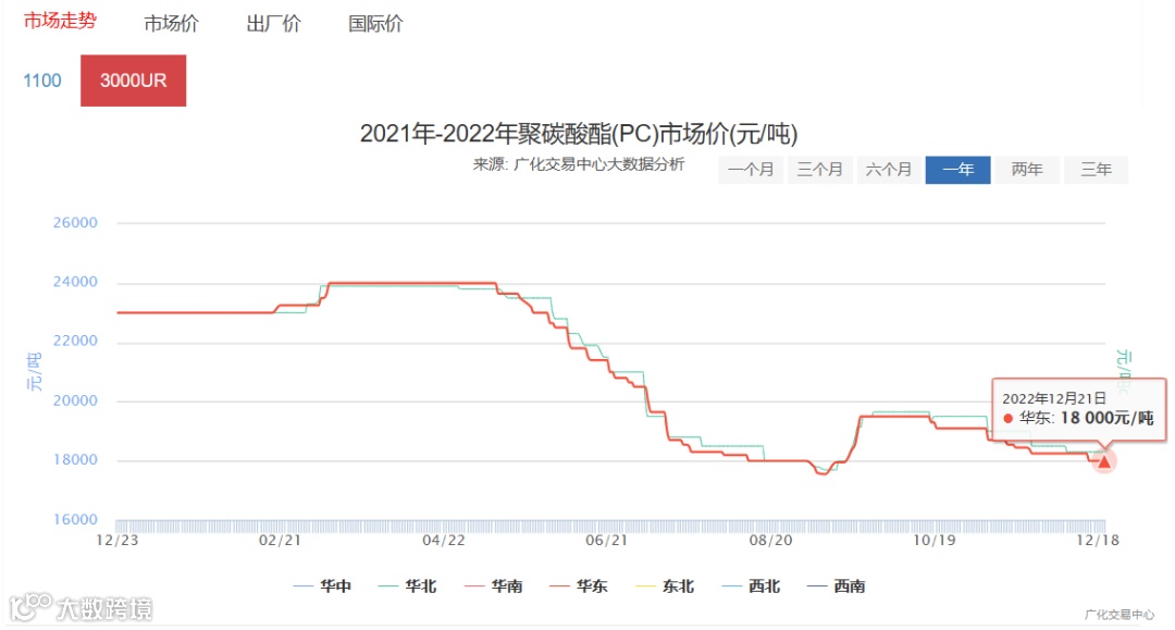 根据卓创资讯,2022年PC价格从23000元/吨,下跌至18000元/吨。目前国内PC市场平稳运行,但整体交投清淡,国内PC工厂多数稳价,山东个别PC工厂出厂仍有下调,幅度为300元/吨。叠加科思创不可抗力及春节假期启动,预计近期PC以维稳运行为主。