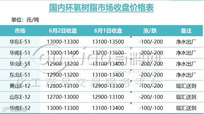 今国内环氧树脂市场跌势延续。临近周末,下游入市询价寥寥,刚需采买不足,持货商库存承压,让利出货,实单商谈重心弱势下行,市场清淡氛围无改观。原料双酚A跌势延续,环氧氯丙烷走势放缓,持货商谨慎观望情绪仍在。截止收盘,华东液体环氧树脂主流商谈价格13000-13300元/吨净水出厂;黄山固体环氧树脂主流商谈价格12800-13100元/吨现汇送到。