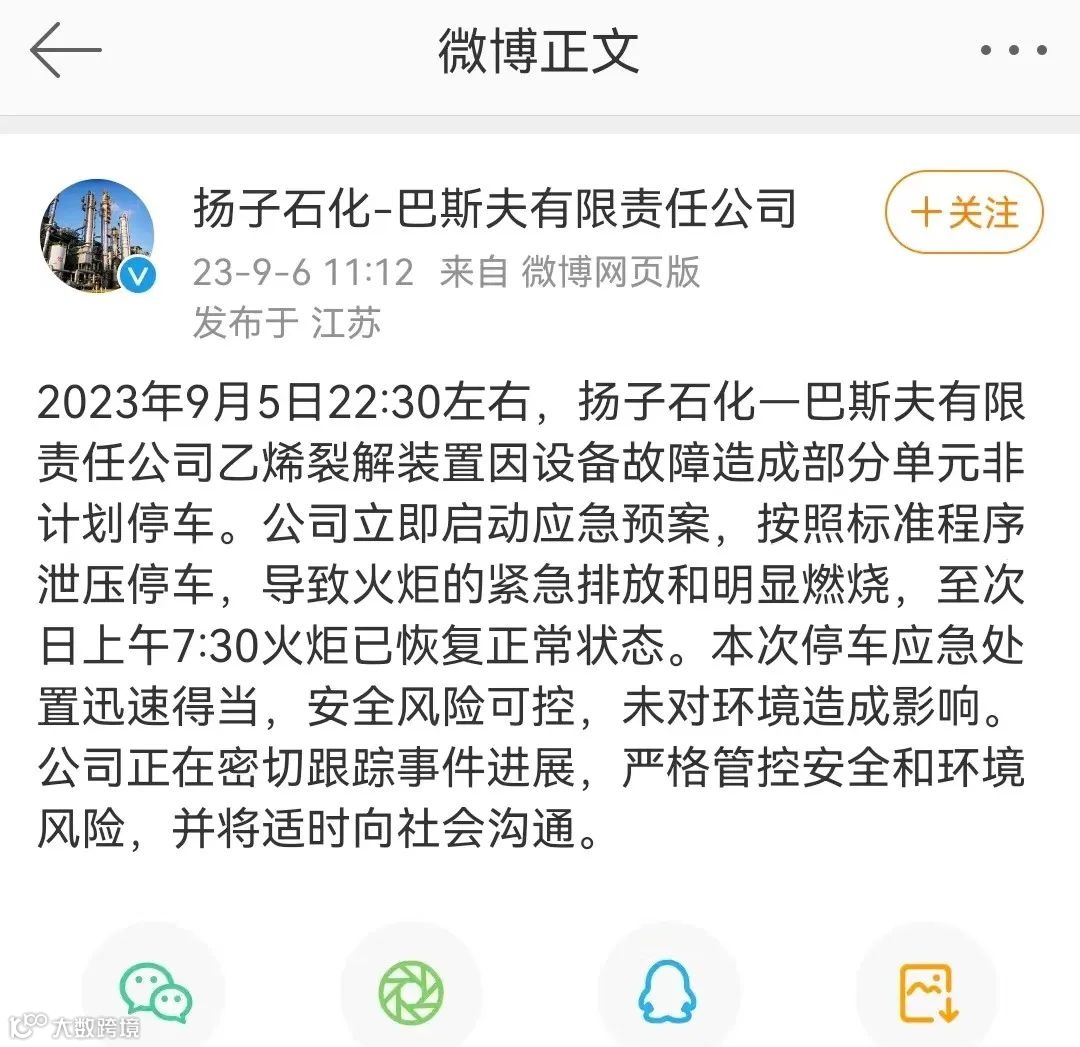 9月6日中午,扬子石化—巴斯夫有限责任公司官方微博发布声明称: