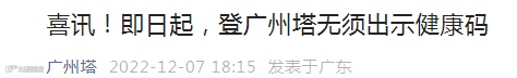 此外,昨日18时,广州塔也发布了通知:根据国务院“新十条”,即时起前来广州塔参观,不再查验健康码,无需提供核酸检测阴性证明。