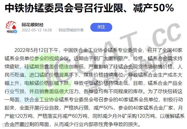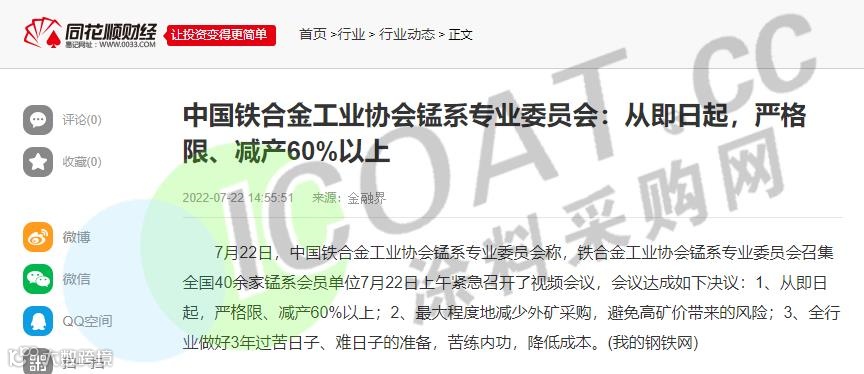 近日,铁合金工业协会锰系专业委员会召集全国40余家锰系会员单位紧急召开了视频会议,会议达成如下决议。从即日起,