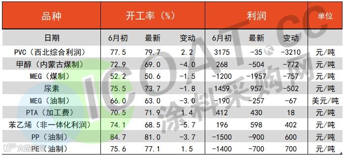 以上焦企、钢企等企业存在的亏损同样也出现在了近期的化工企业身上。进入6月后宏观加息落地,市场交易衰退预期,走势反转。化工品领先于上游原油开启下跌,整体呈现利润压缩、亏损扩大的格局。PVC、甲醇、乙二醇等化工品利润均为负值,且开工率均有所下跌,最低降为五成。