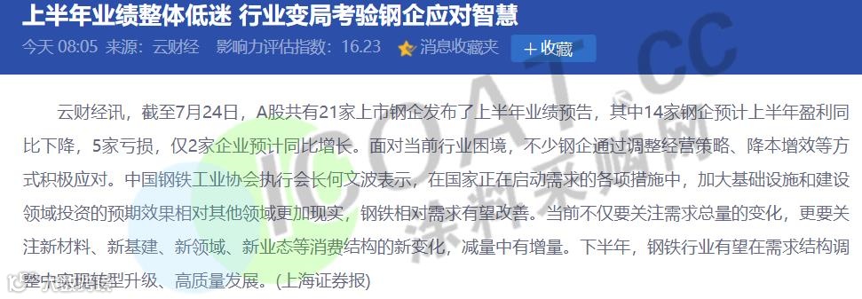 目前14家钢企预计上半年盈利同比下降,5家亏损,不少钢企通过调整经营策略、降本增效等方式积极应对。据不完全统计,目前又有