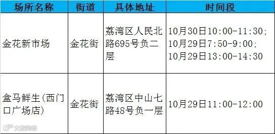 金花街道:广州悦赏食餐饮有限公司、三甫社区金信大厦B座、金花新市场、盒马鲜生(西门口广场店);