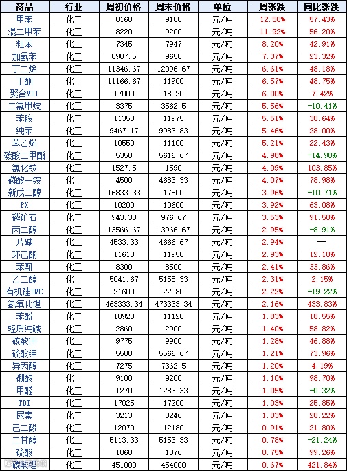 据生意社价格监测,2022年第23周(6.6-6.10)大宗商品价格涨跌榜中化工板块环比上升的商品共47种,其中涨幅5%以上的商品共11种,占该板块被监测商品数的10.1%;涨幅前3的商品分别为甲苯(12.50%)、混二甲苯(11.92%)、粗苯(8.20%)。