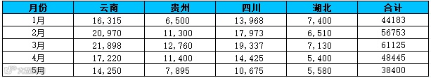 随着气温的急剧升高,部分地区的开工率也有所下降,根据百川盈孚数据统计,5月以来黄磷产量出现大幅减少,其中云南、贵州、四川地区产量分别环比减少了17.25%、30.75%以及26.00%。