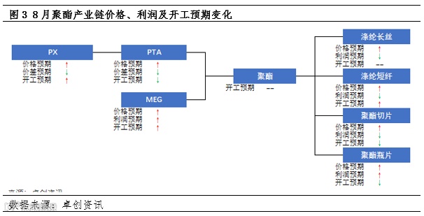 另一方面,从价值链角度来看,8月聚酯原料PX、MEG存在开工攀升的预期,8月中下旬PTA及下游聚酯部分产品因盈利水平影响开工或存在微幅下挫的可能。聚酯价值链的变化将受到PTA及下游聚酯产品的开工变化影响出现分化,价值链或出现向下游转移的趋势。