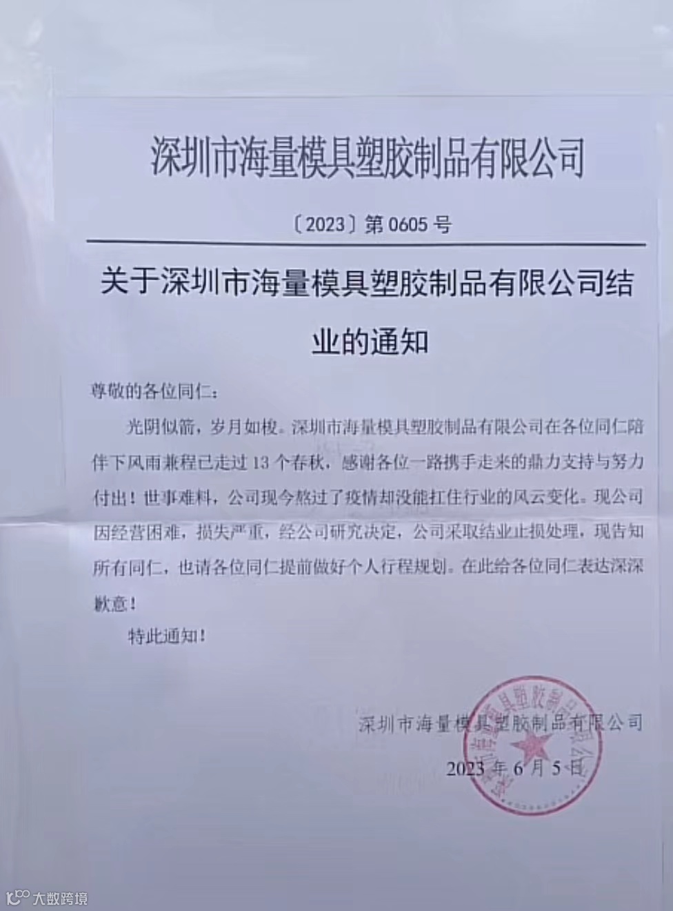 而另外一家则是:经营了13年的深圳市海量模具塑胶制品有限公司(以下简称“海量模具”)于6月5日也正式对外宣布结业。海量模具老板娘表示:“主要是被客户拖垮,被高管抽空。公司养了一帮蛀虫和吸血鬼,其实大部分供应商都是好的。
