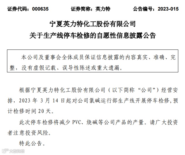 宁夏英力特化工公告,3月14日起对公司氯碱运行部生产线开展停车检修,预计检修时间20天。此次停车检修将减少PVC、烧碱等公司产品的产量;