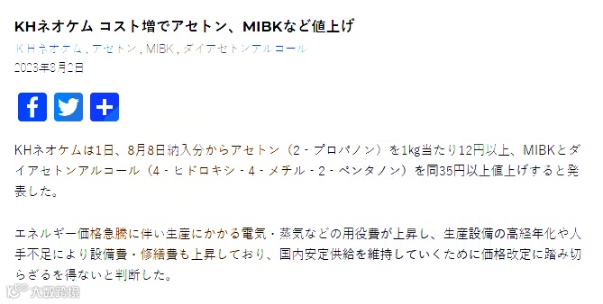 8月1日,日本一家丙酮大型生产商KH株式会社宣布于8月8日起,将提高公司生产的各种化学的价格。涨价产品及涨幅如下: