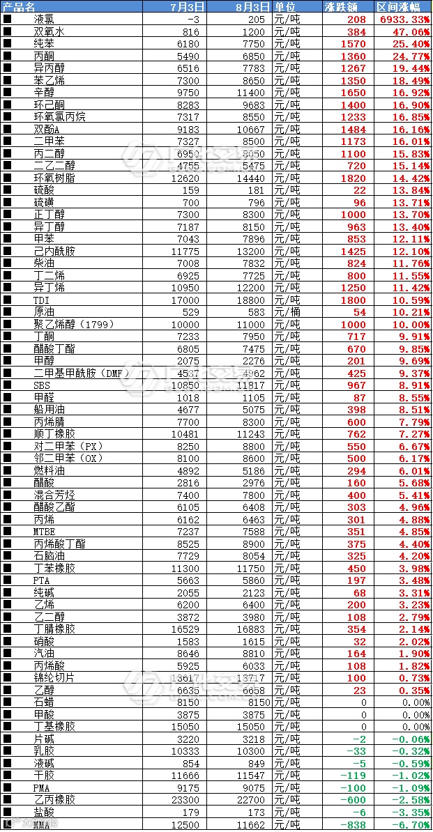 化市要起飞了?油价走高利好化工市场,老板们生意好不好不知道,但涨价函已经开始轰炸市场了,让我们来看看8月都有哪些产品要开涨: