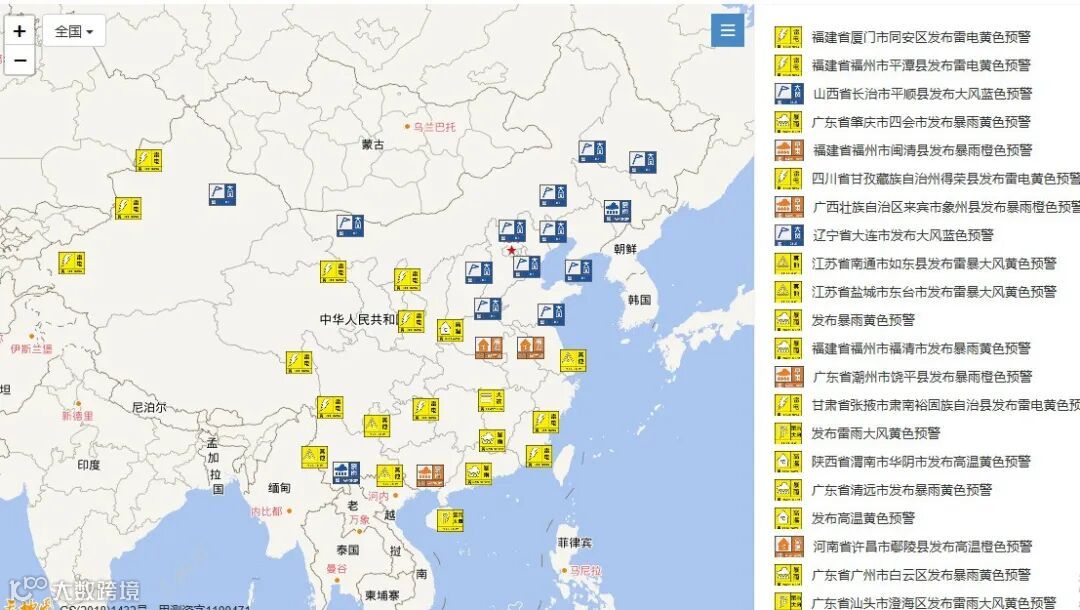 据国家气象局官网显示,目前全国已发布123个气象灾害预警。