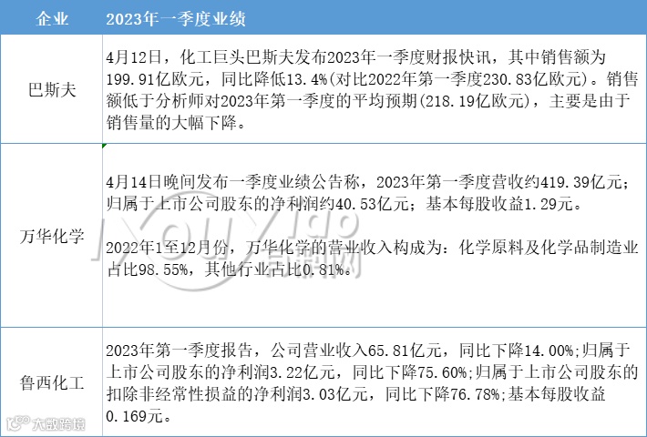 终端市场不振下,巨头业绩也不好看,根据最新发布的数据来看,巴斯夫、万华化学、鲁西化工2023年第一季度业绩均同比下滑: