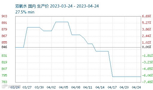 ▶双氧水:自从进入4月后,双氧水便进入下行通道。目前国内报价在795元/吨附近,较年内最高价跌幅近10%。短期来看,双氧水或仍下行空间。