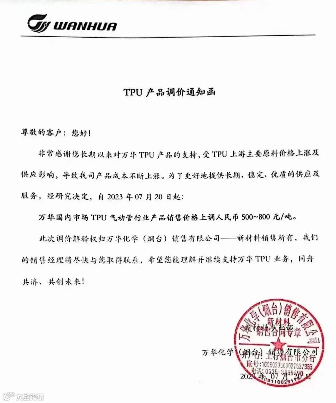 7月20日,万华化学发布TPU产品调价通知函。万华化学称,受TPU上游主要原材料价格上涨及供应影响,导致陈品成本不断上涨,为了更好地提供长期、稳定、优质的供应及服务,自2023年7月20日起万华国内市场TPU气动管行业产品销售价格上调人民币500-800元/吨。
