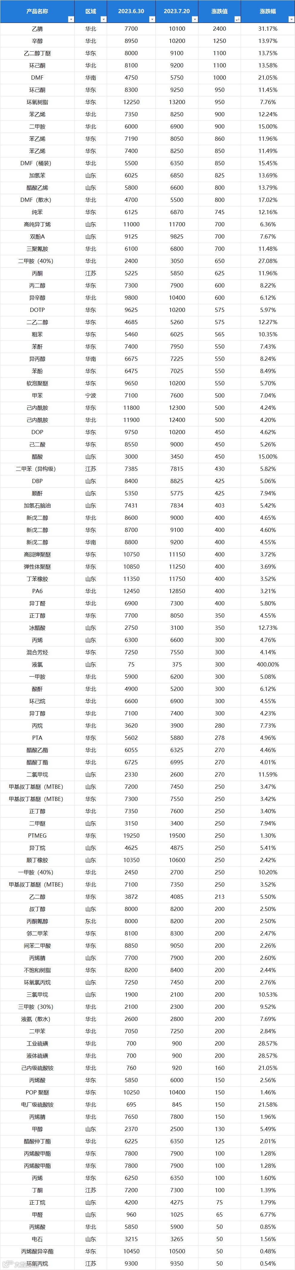 三季度以来,已经有90多种化工品价格调涨,其中乙腈、辛醇、环己酮、DMF、环氧树脂、苯乙烯等化工品价格出现幅度不等的上涨。