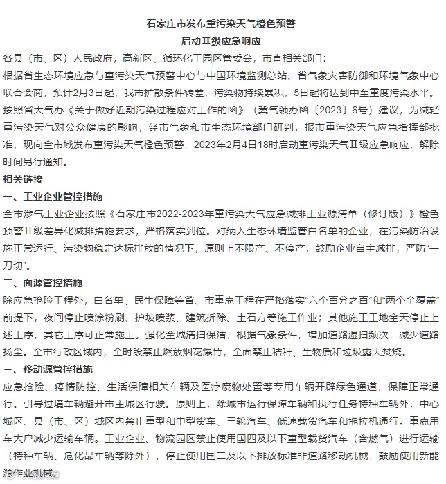 石家庄市重污染天气应急指挥部批准,自2023年2月4日18时启动重污染天气Ⅱ级应急响应,解除时间另行通知。