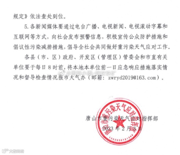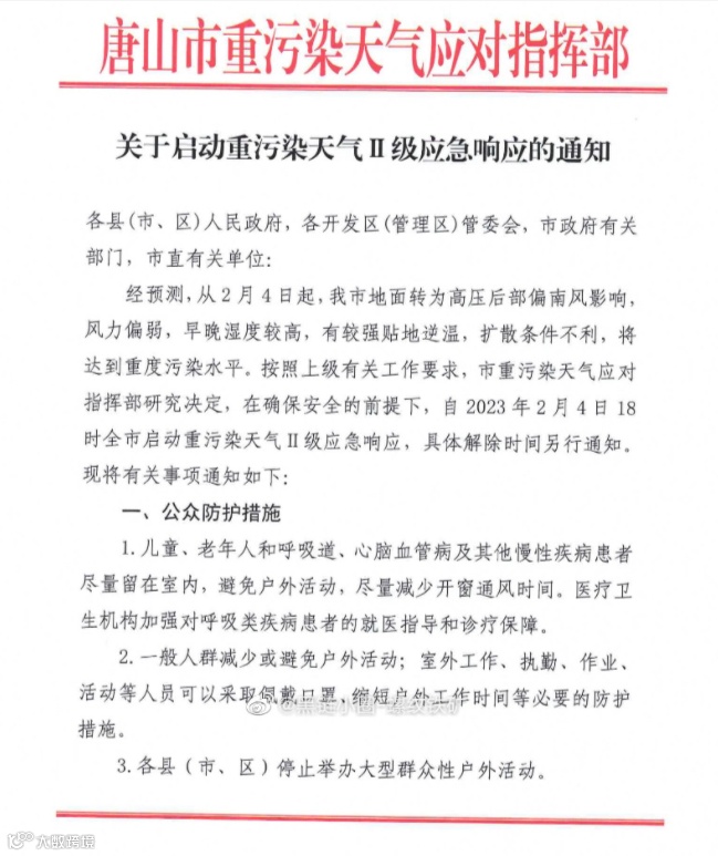 唐山市自2023年2月4日18时全市启动重污染天气Ⅱ级应急响应,具体解除时间另行通知。
