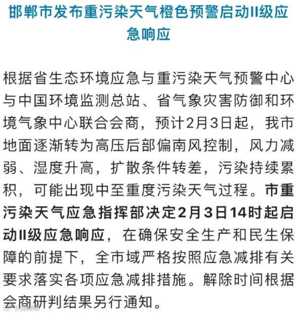 邯郸市重污染天气应急指挥部决定2月3日14时起启动II级应急响应,在确保安全生产和民生保障的前提下,全市域严格按照应急减排有关要求落实各项应急减排措施。解除时间根据会商研判结果另行通知。