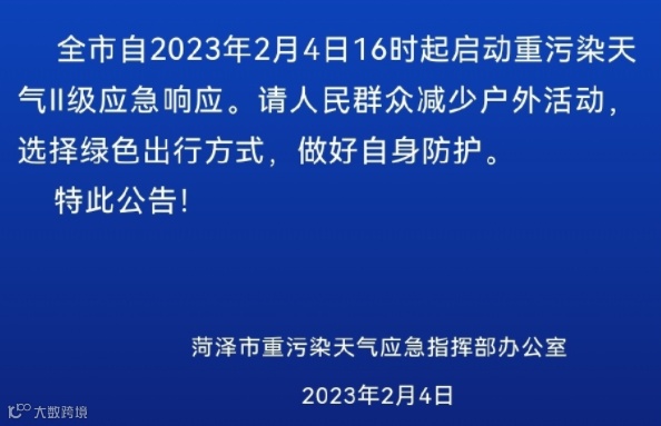 菏泽市重污染天气应急指挥部办公室通知全市自2023年2月4日16时起启动重污染天气Ⅱ级应急响应。