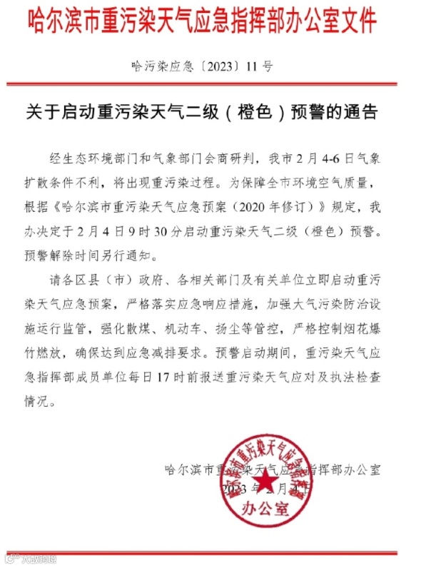 为保障全市环境空气质量,根据《哈尔滨市重污染天气应急预案(2020年修订)》规定,哈尔滨市重污染天气应急指挥部办公室决定于2月4日9时30分启动重污染天气二级(橙色)预警,预警解除时间另行通知。