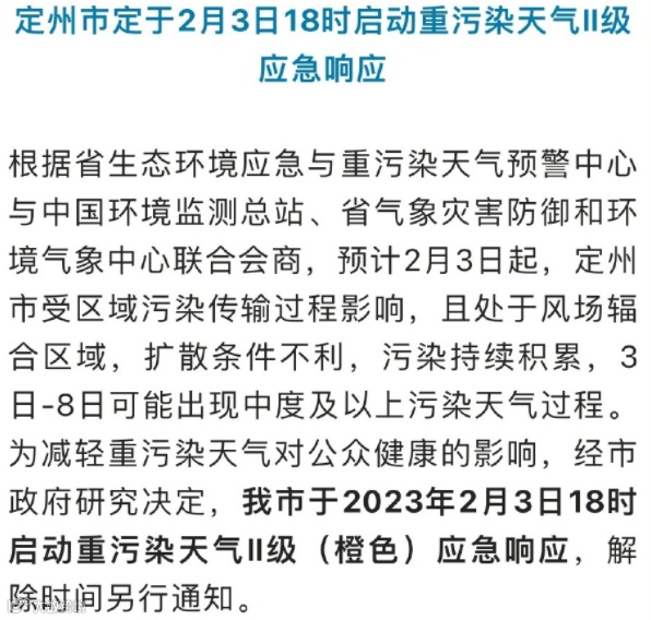 定州市定于2月3日18时启动重污染天气Ⅱ级(橙色)应急响应。解除时间另行通知。
