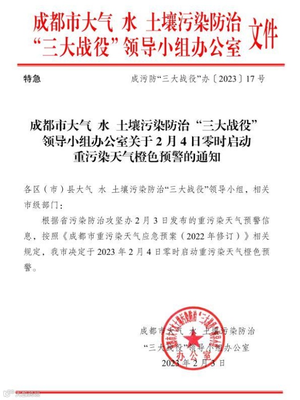 成都市大气、水、土壤污染防治“三大战役”领导小组办公室发布通知,根据四川省污染防治攻坚办发布的重污染天气预警信息,按照《成都市重污染天气应急预案(2022年修订)》相关规定,成都决定于2023年2月4日零时启动重污染天气橙色预警。