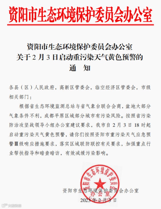 资阳市自2月3日18时起启动重污染天气黄色预警,请你们按照资阳市重污染天气应急预警M级响应措施要求,落实区域联防联控有关要求,加强重点行业帮扶指导和暗查暗访,有效减缓污染影响。
