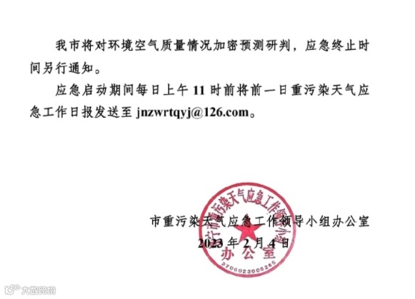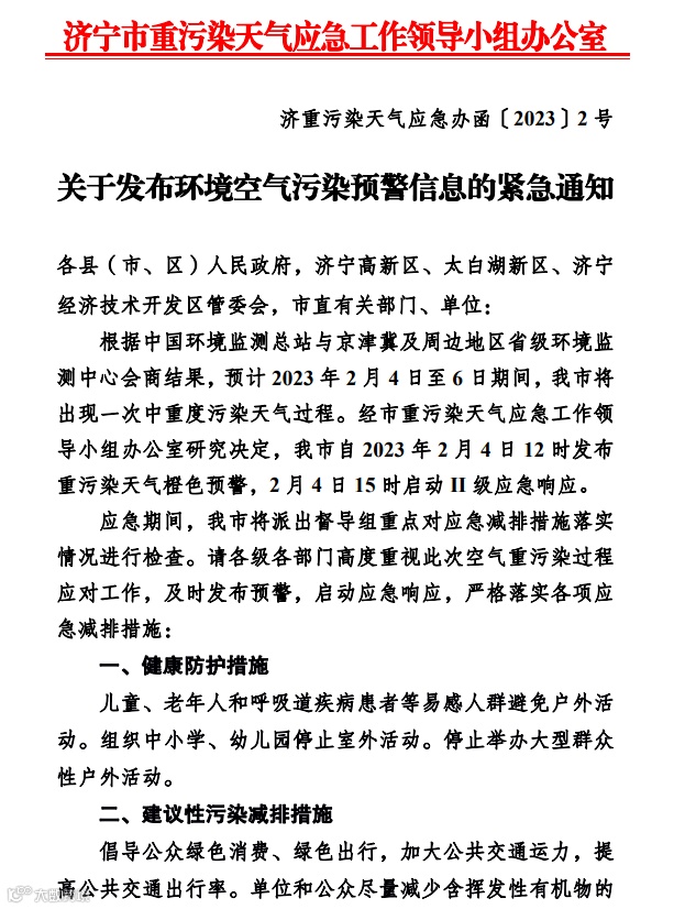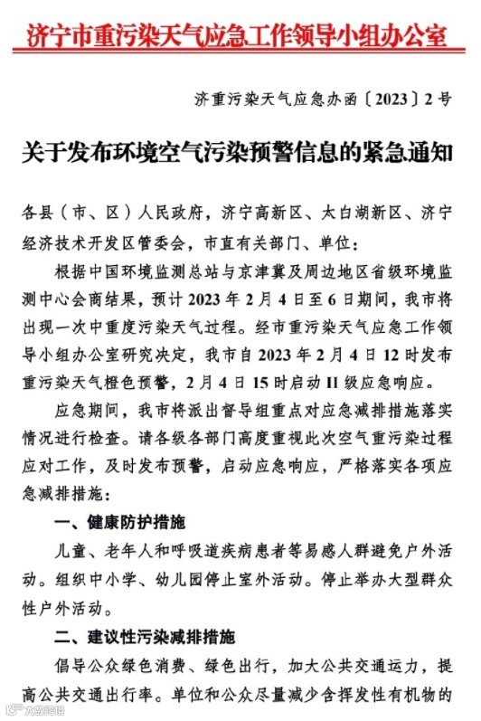 济宁市重污染天气应急工作领导小组办公室研究决定,自2023年2月4日12时发布重污染天气橙色预警,2月4日15时启动II级应急响应。