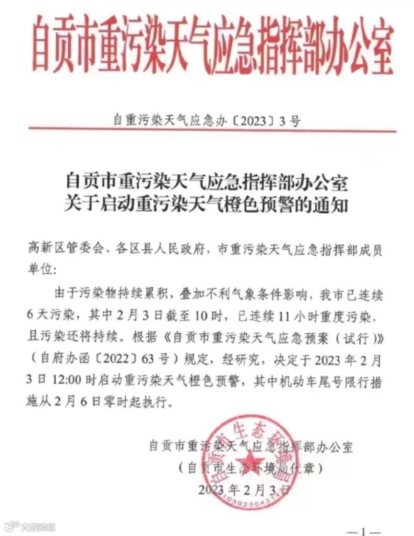 自贡市自2月3日12时启动重污染天气橙色预警,自2月6日零时起,执行机动车尾号限行措施。重污染天气橙色预警的启动,也将代表新一轮汽车尾号限行的实施,请各位私家车主请注意自己的车辆号牌尾号哟,合理安排、绿色出行。