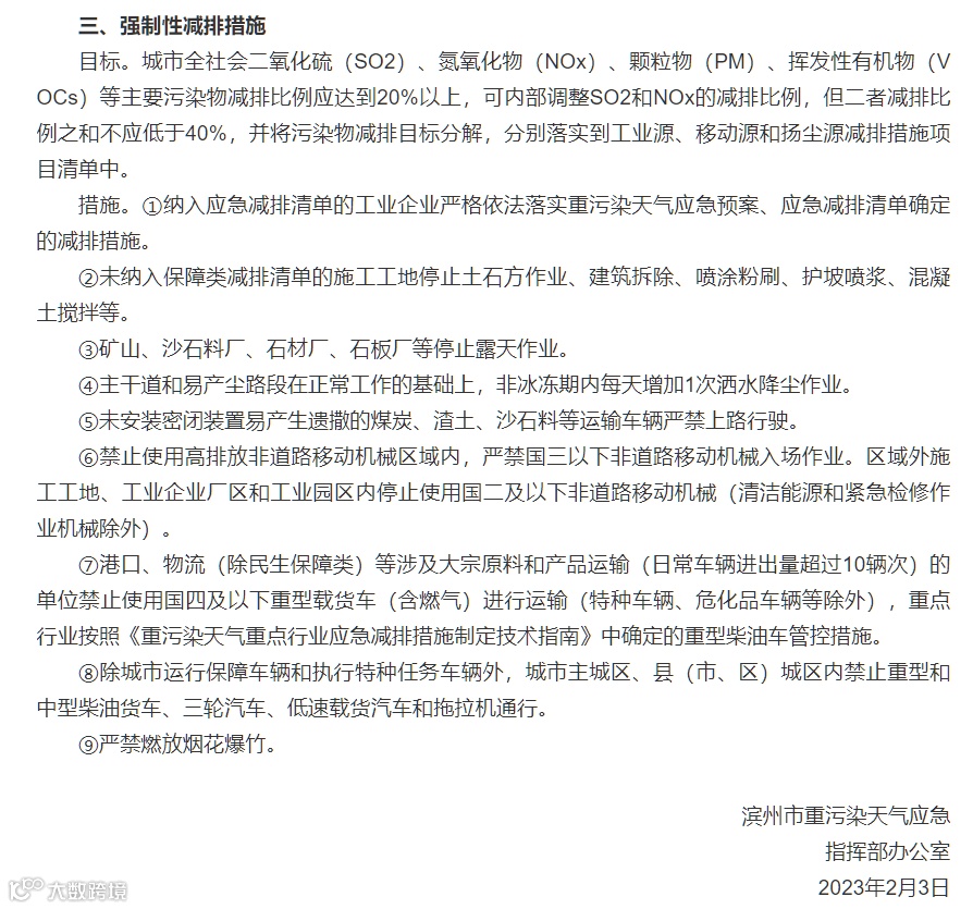 滨州市重污染天气应急指挥部办公室要求,于2月3日23时发布重污染天气橙色预警,并于2月4日16时启动Ⅱ级应急响应。