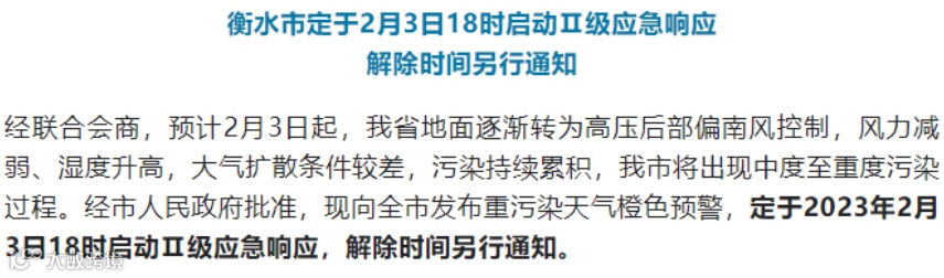 衡水市定于2月3日18时启动II级应急响应,解除时间另行通知。