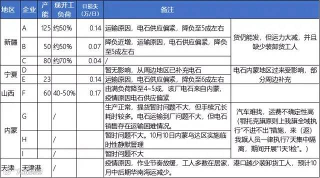 其中,新疆、宁夏、山西等企业涉及产能约338万吨,不完全统计影响日产量月4100吨。内蒙出货节奏放缓,天津港因疫情作业放缓,预计10月中下旬市场均处于供货紧张、货运紧张状态。