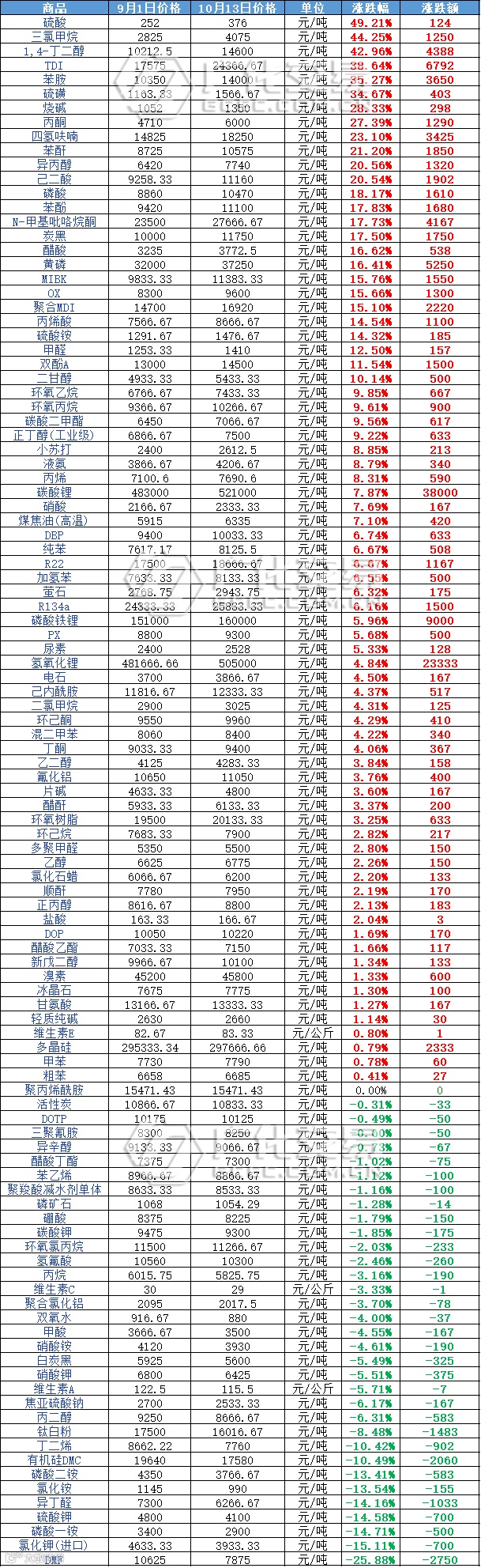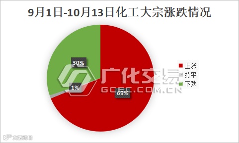 9月至今,上涨的化工大宗共计75种,占比69%,下跌化工大宗共计33种占比30%,仅有1%的产品价格维持不变。