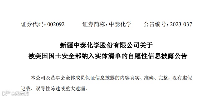 6月12日晚间,中泰化学发布关于被美国国土安全部纳入实体清单的自愿性信息披露公告。