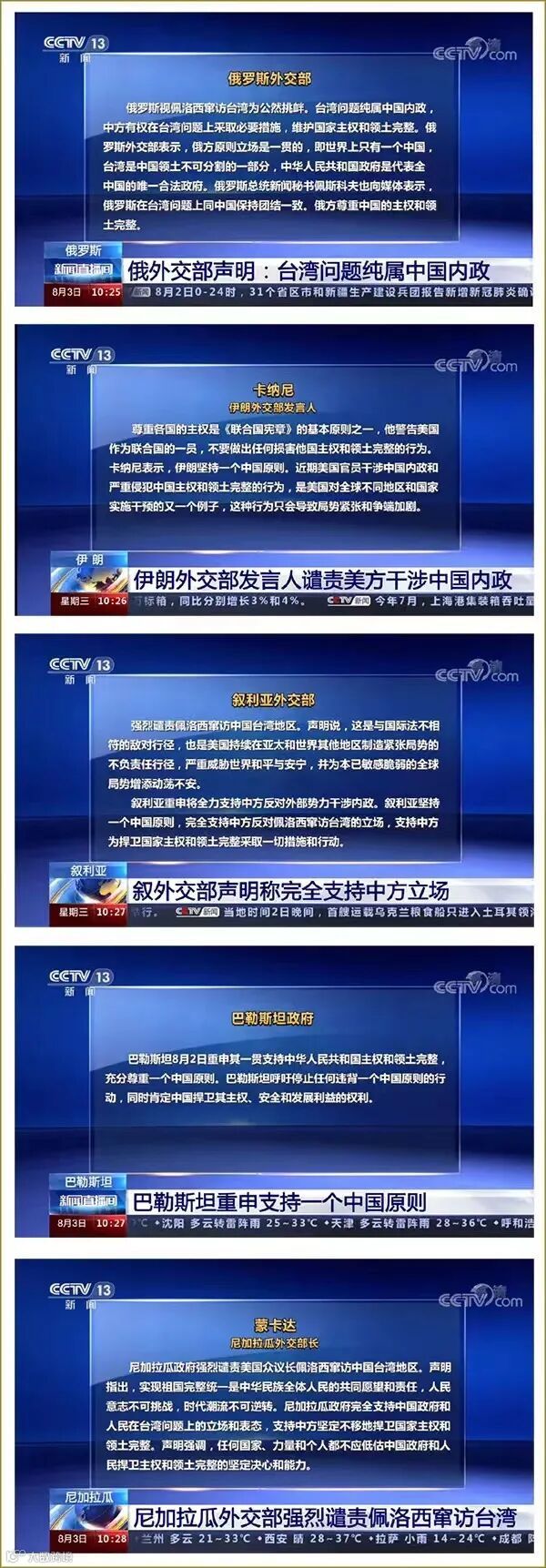 对于美国国会众议长佩洛西不顾中方强烈反对和严正交涉,窜访中国台湾地区的行为,俄罗斯、伊朗、叙利亚、巴基斯坦等多国政府发表声明表示强烈谴责,并重申支持一个中国原则。