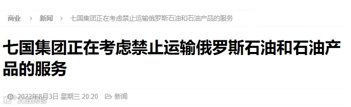 据俄罗斯卫星通讯社报道,G7国家在声明中表示正在考虑在全球范围内禁运俄罗斯石油和石油产品,除非是有的购买价格等于或低于与国际伙伴协商的价格。