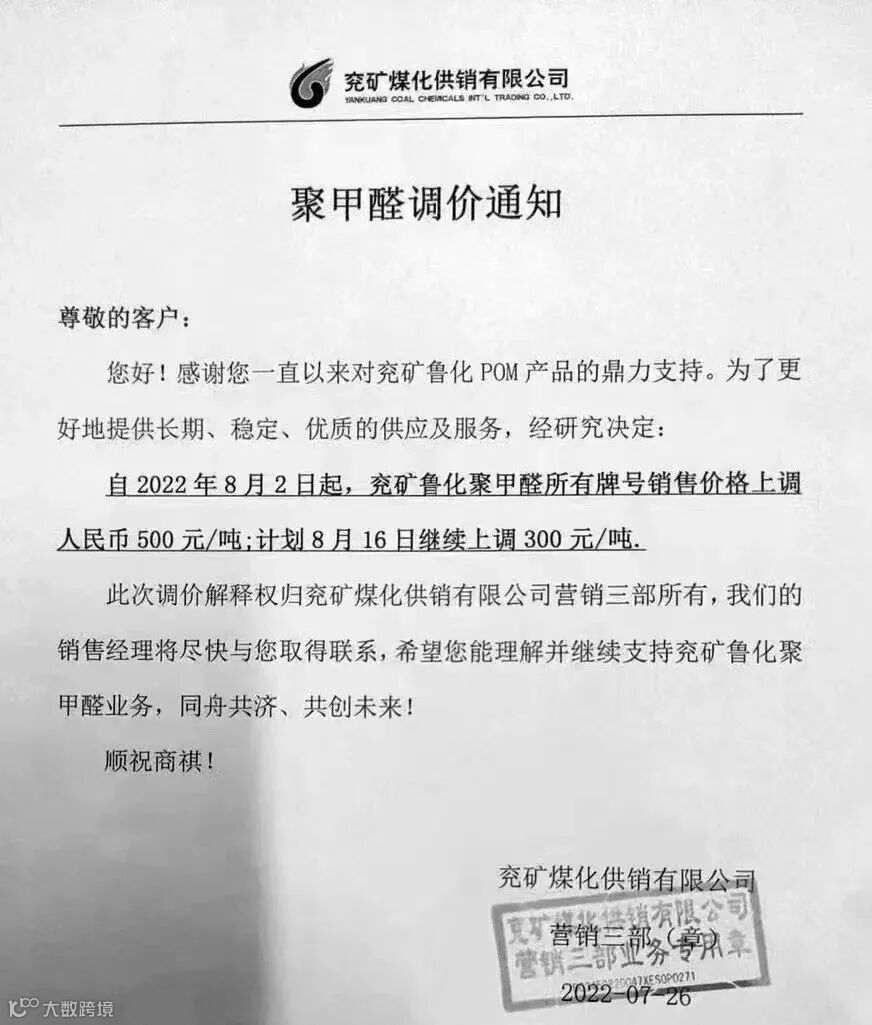 8月2日,兖矿鲁化所有聚甲醛产品价格上调500元/吨,还计划于8月16日继续上调。