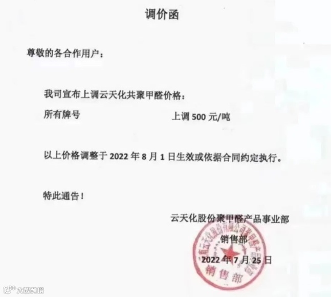 8月1日起,云天化集团将上调云天化聚甲醛(POM)所有牌号产品价格,涨幅为500元/吨。