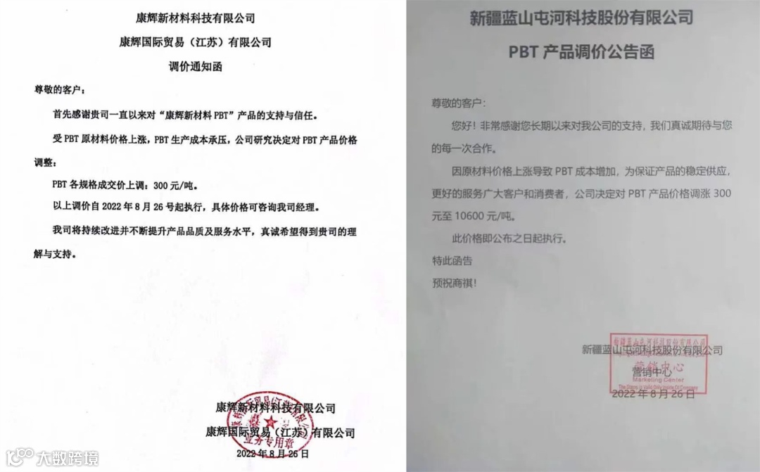 ▶ 同一天,蓝山屯河也发出了涨价通告:宣布将对PBT系列产品调涨300元/吨。