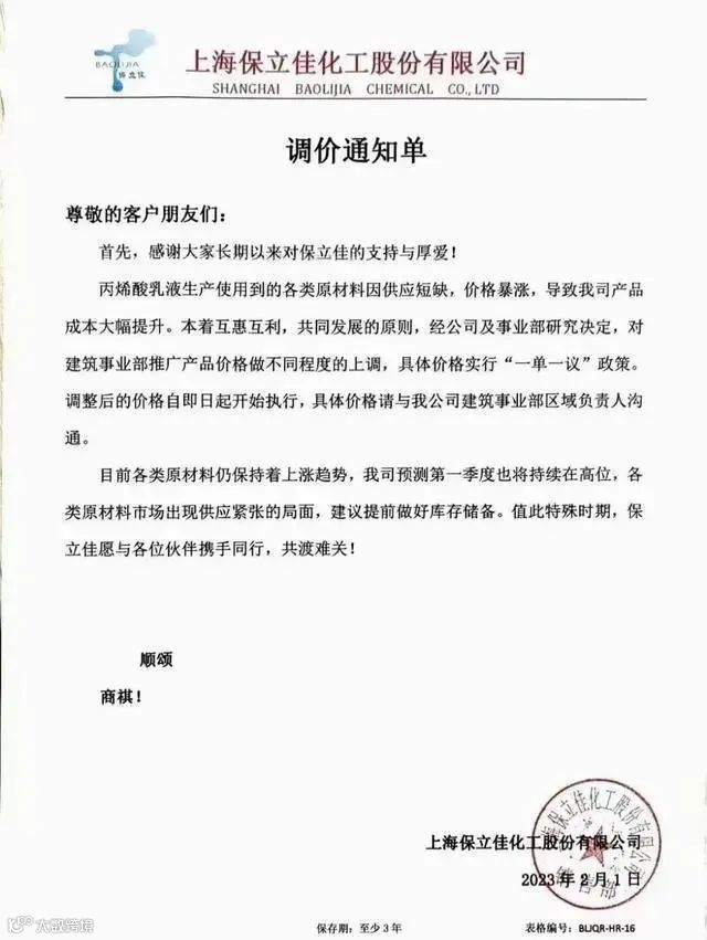 巴德富集团有限公司建涂事业部2月2日发布《关于执行新报价的通知函》称,开年以来,原材料价格持续上涨。截止2月2日,丙烯酸丁酯(华东)单日价格已至10600元/吨,年后持续四连涨累计涨幅1000元/吨,原料上涨对其产品成本构成了极大的挑战,自即日起,将对产品价格进行调整。