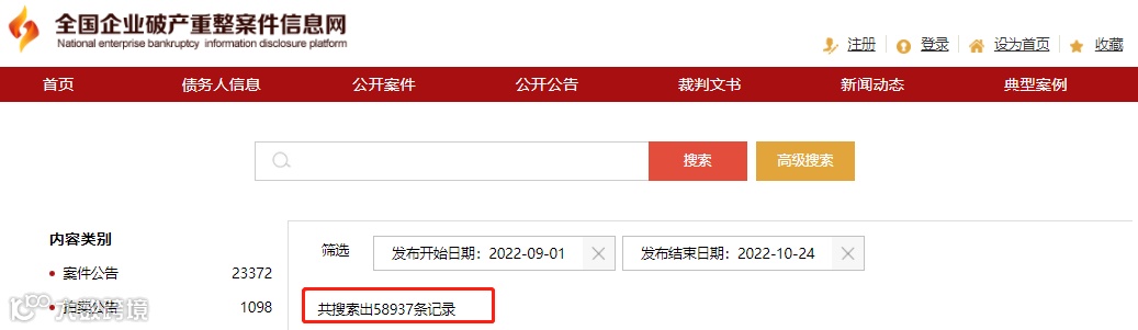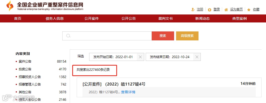 累了)。根据全国企业破产重整案件信息网的数据显示,2022年初至今已有2227599条,仅仅9-10月两月的破产冲这个案件已达58937条。