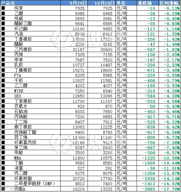 ,广化君检测的10月大宗榜商品里也有36种出现下跌。