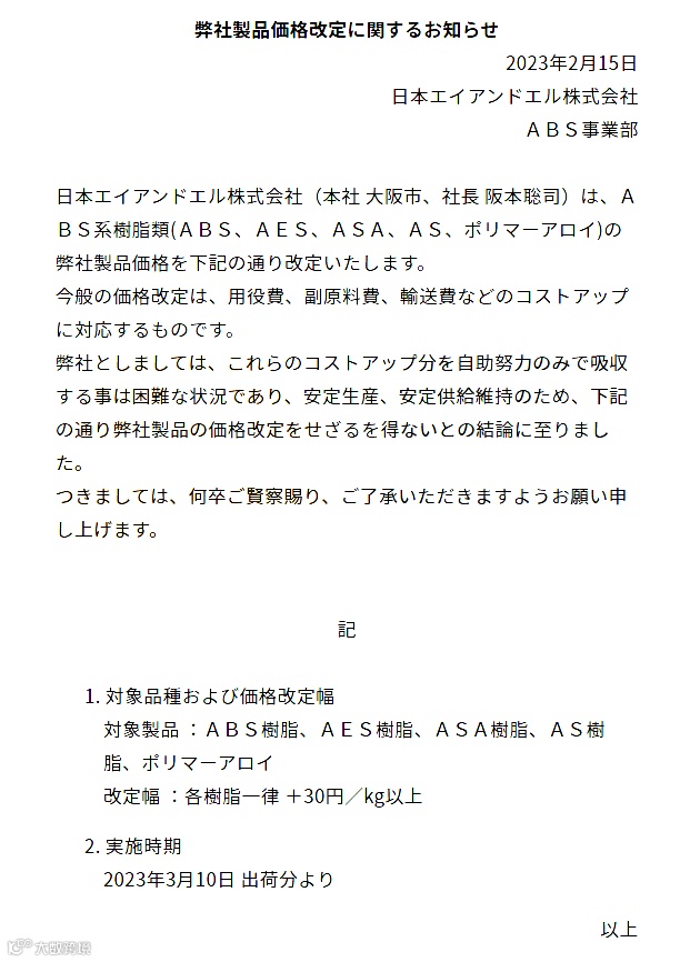2月15日,由住友化学和三井化学共同出资的日本aindell株式会社发布涨价通知称,受相关原料和运输费的成本上涨影响,于3月10日起,上调公司ABS系列树脂类产品的价格,具体包括ABS、AES、ASA、AS以及聚合物合金等,涨幅为30日元/kg(约合1532元/吨)以上。
